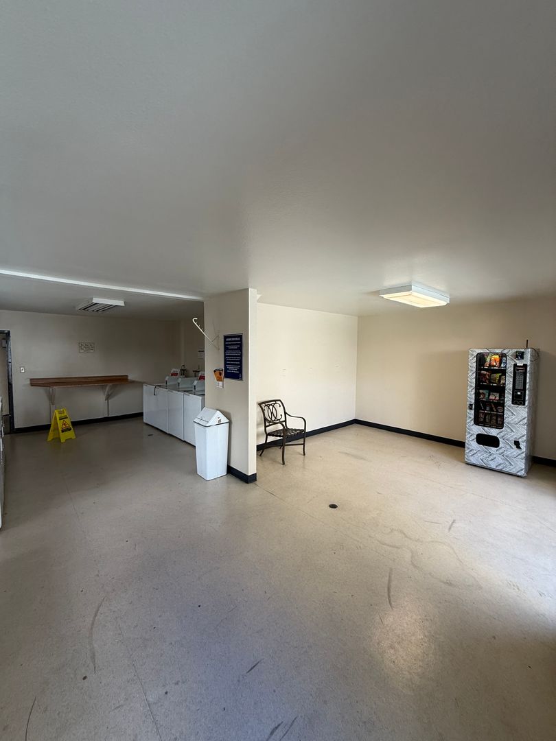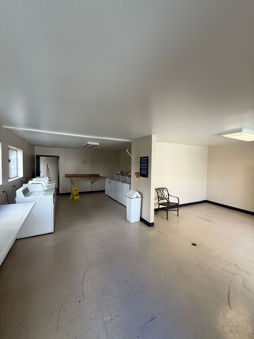 Modern kitchen featuring granite countertops, stainless steel appliances, and ample storage, spacious bedroom with a large extra-large closet, community laundry room with ample machines, central A/C and heating for year‑round comfort.