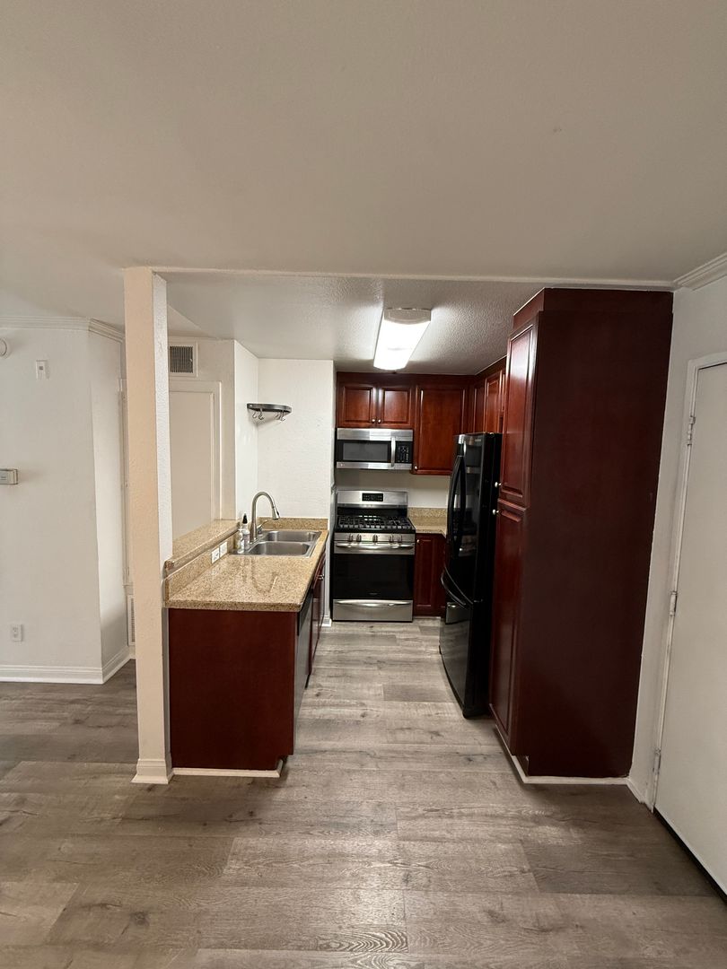 Step into this beautifully updated one‑bedroom, one‑bathroom condo located in the highly sought‑after Met Warner Center, a private, guard‑gated community in the heart of Woodland Hills. This inviting home offers an open‑concept layout with abundant natural light, creating a warm and welcoming atmosphere from the moment you enter. Bright living room with a cozy fireplace and sliding doors leading to a private balcony